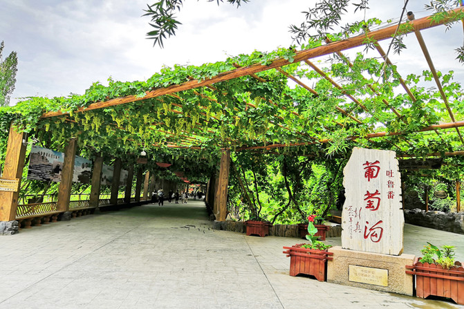 8.【吐鲁番葡萄沟】(门票+电瓶车75+25):葡萄沟是火焰山山谷中最大的一个沟谷,南北长8公里,沟谷两侧悬崖对峙,沟内溪流环绕,水质纯净。长满香甜葡萄的葡萄架布满沟内,是吐鲁番当地最大的葡萄种植基地。